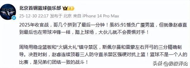 北京官方更新发文:“2025年收官战,哥几个拼到了最后一分钟!虽85:91憾负广厦男篮,但就像赵睿直到最后也在带球冲锋一样,踏上球场,大伙儿就不会畏惧对手!”