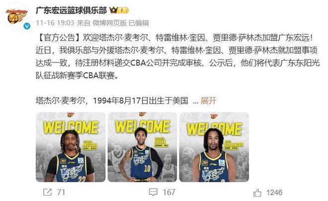 早在11月16日,广东队一口气官宣了3名外援,分别是上赛季效力于广州龙狮队的塔杰尔-麦考尔、上赛季效力于北控男篮的贾里德-萨林杰,还有上赛季在NBA魔术队打球的特雷维林-奎因。这个休赛期广东队放弃了上赛季的全部四名外援,已经确定的三名外援都是很有实力的,其中奎因上赛季还是NBA魔术队的主要轮换,麦考尔和萨林杰也经过CBA球队的考验,球队的整体实力较上赛季有了很大的提升。